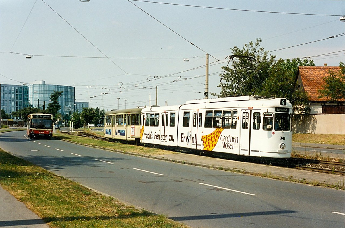 Am 6. August 1994 verlässt der sechsachsige Gelenk-Triebwagen 341 mit einem unbekannten vierachsigen Beiwagen die Endstelle, deren Namen ich jetzt wieder nicht mehr weiß...