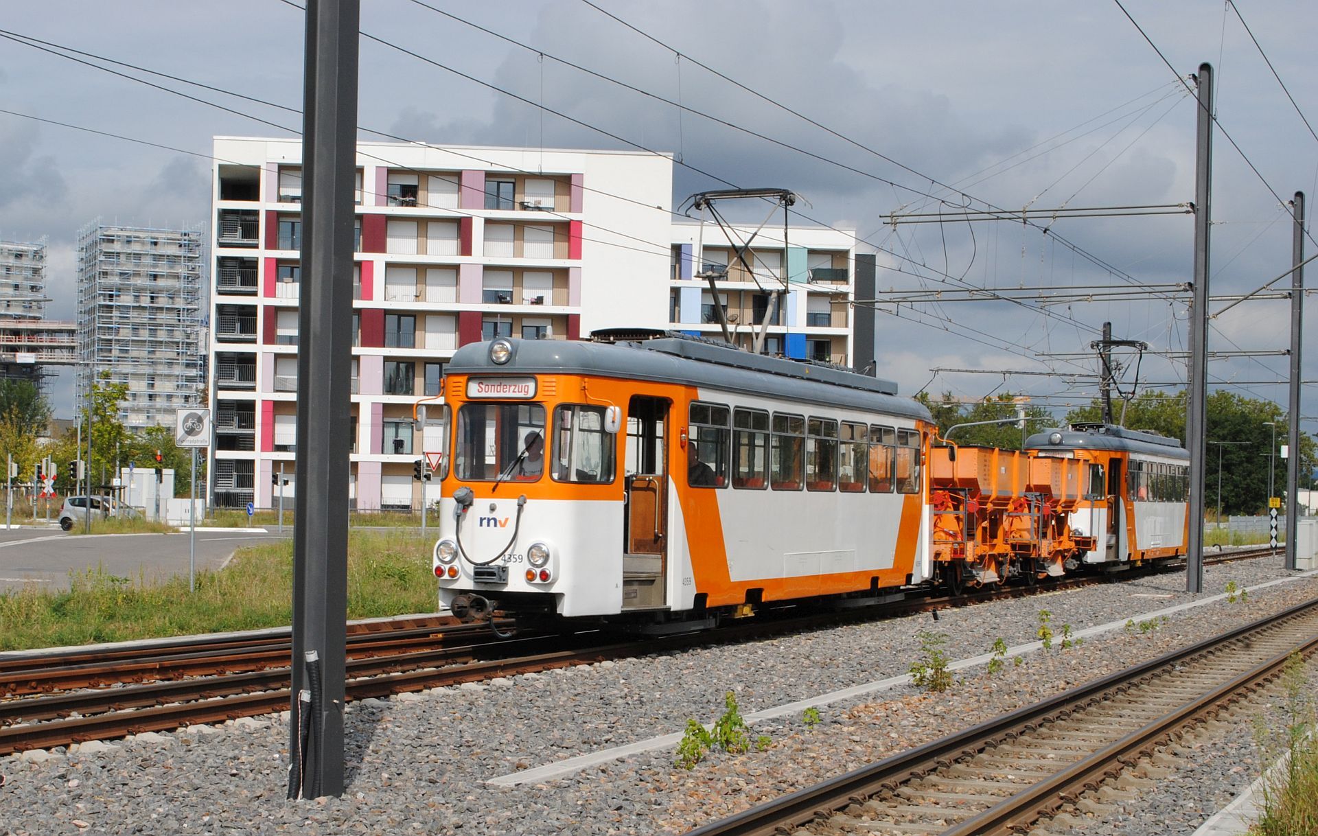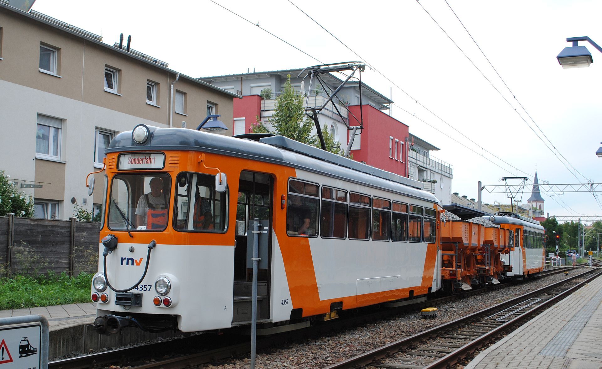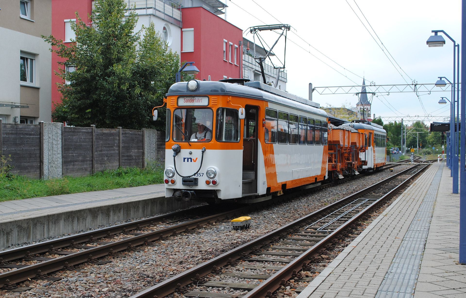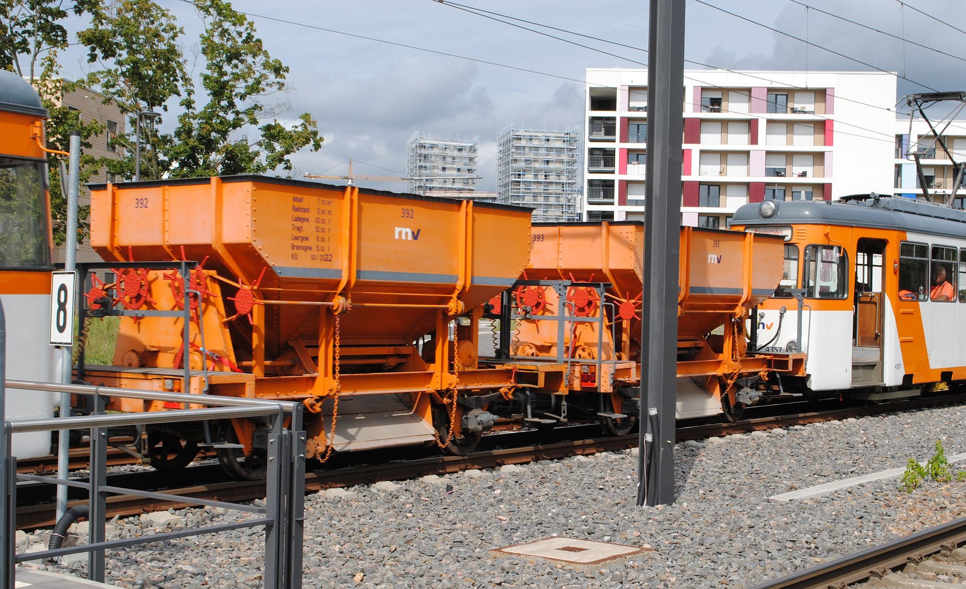 Tatsächlich kamen um 13.50 Tw 357 und 359 mit 2 Schotterwagen von Käfertal. Nach kurzem Aufenthalt fuhren sie weiter nach Weinheim.
