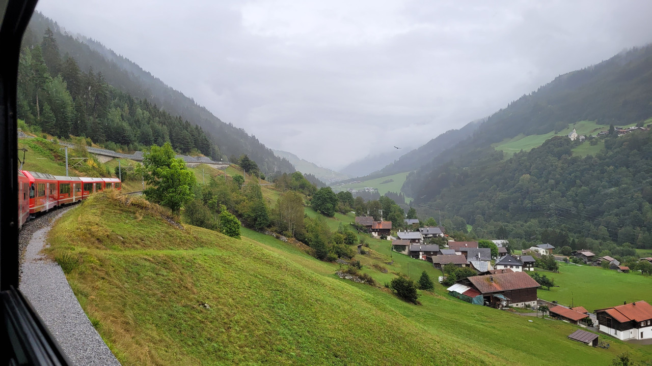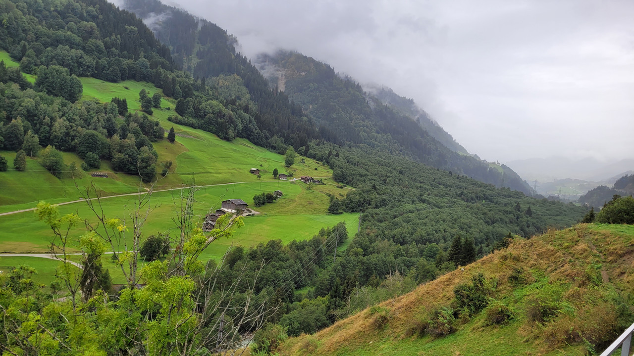 Trun geht es merklich bergauf (vorher auch schon, aber eher „unmerklich“), wie ein/zwei Blicke aus dem (zu öffnenden) Fenster in der Nähe des Dorfes
