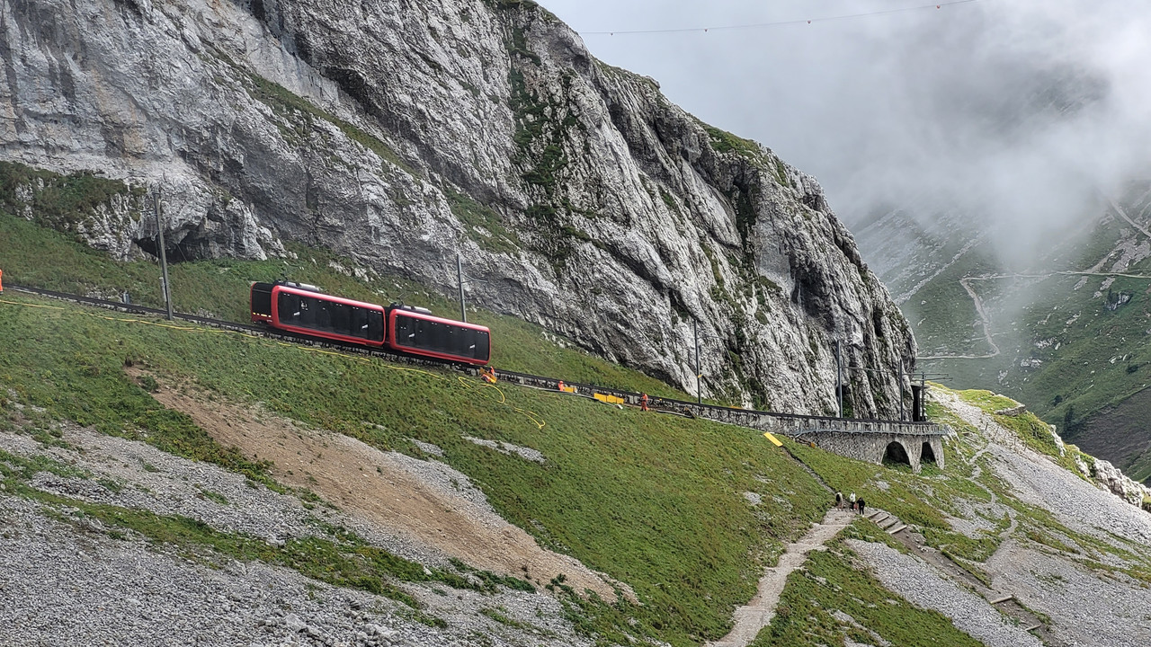Pilatus Kulm bemerkten wir, dass nun etliche Fahrgäste wieder ins Tal wollten. Wie auf dem Bilde zu sehen, fuhr jedoch nur ein Doppelzug (die